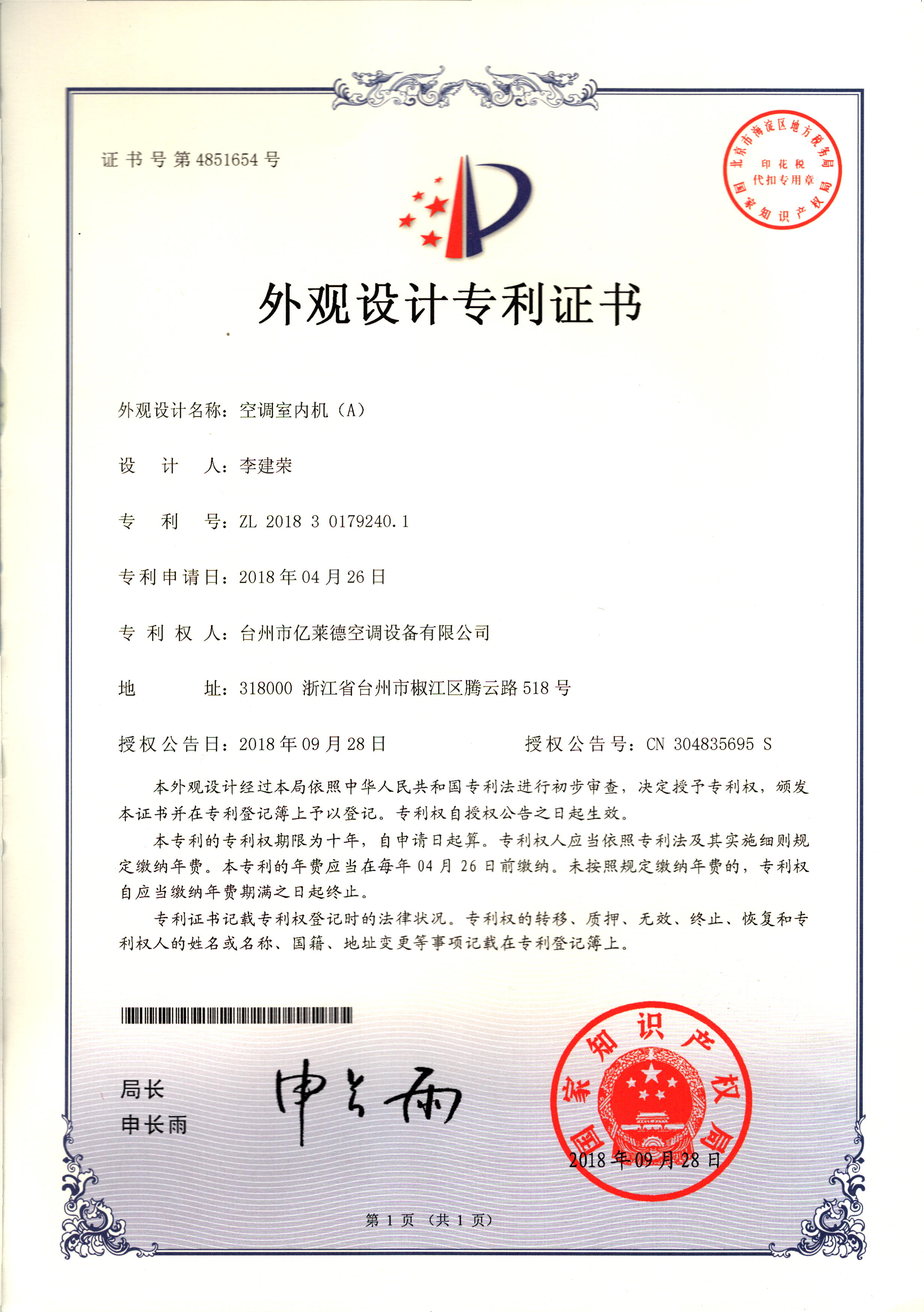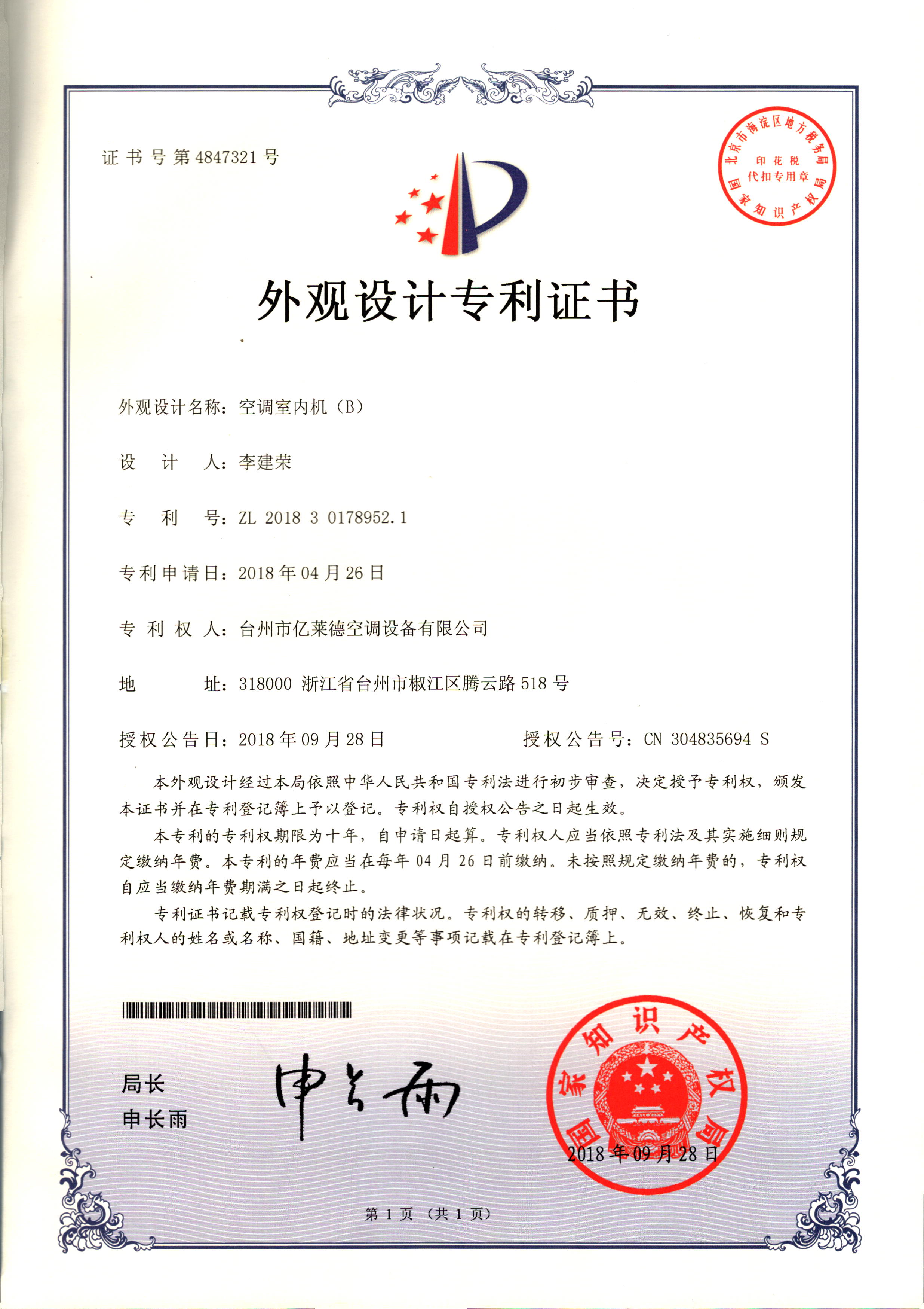 外觀設計專利證書--空調室內(nèi)機(A...