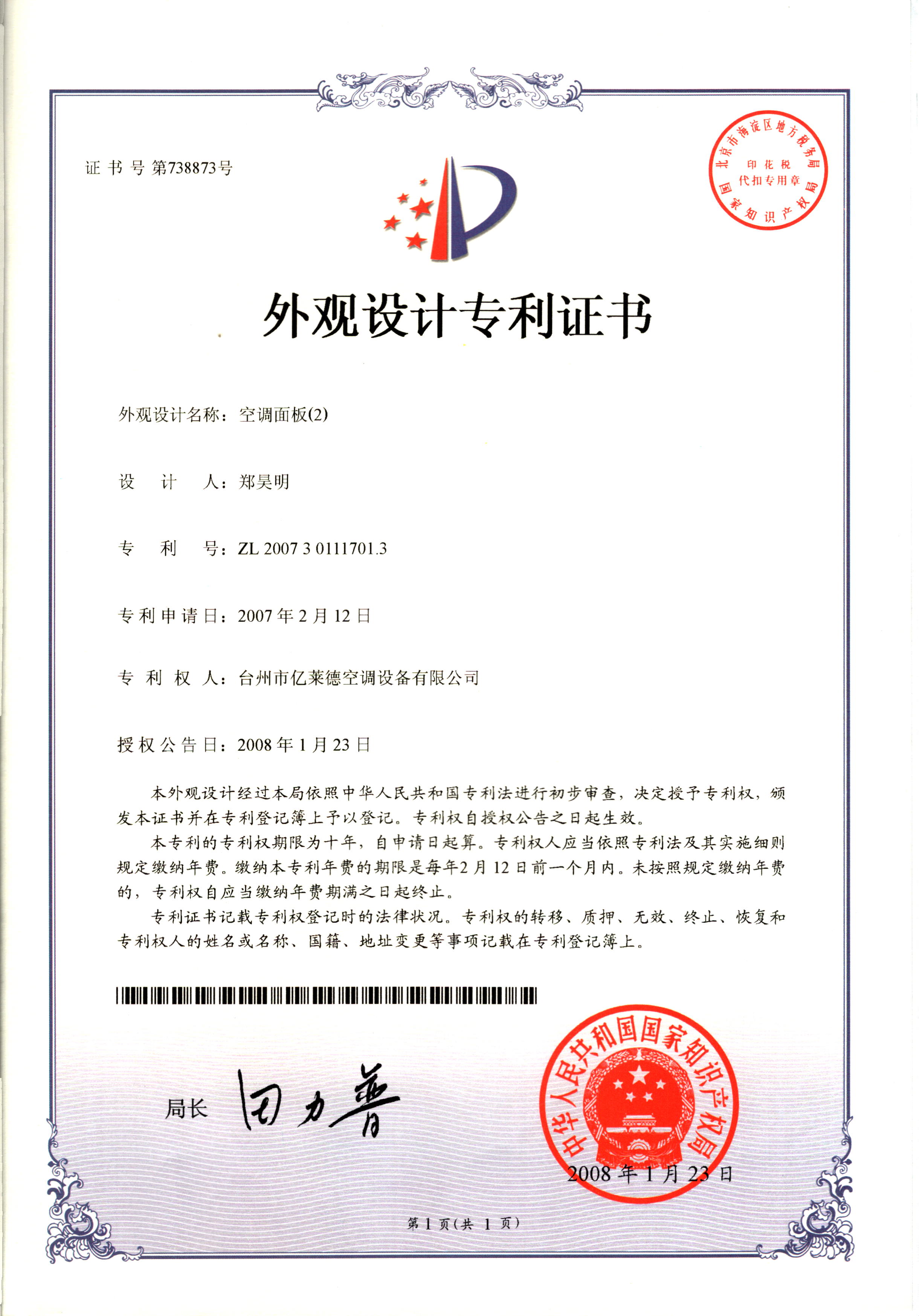外觀設計專利證書--空調面板(2)