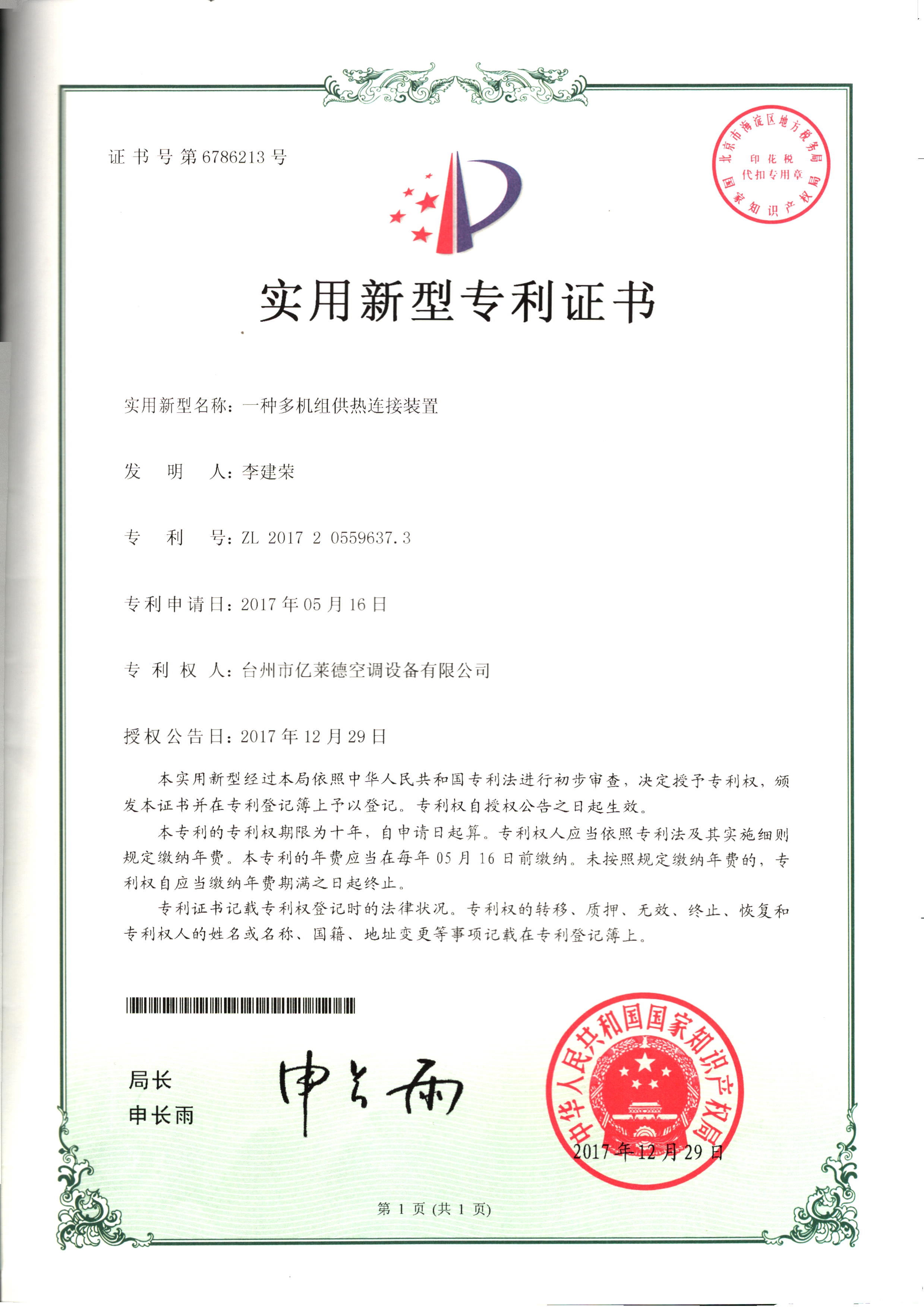 實用新型專利證書--一種室內(nèi)冷暖...