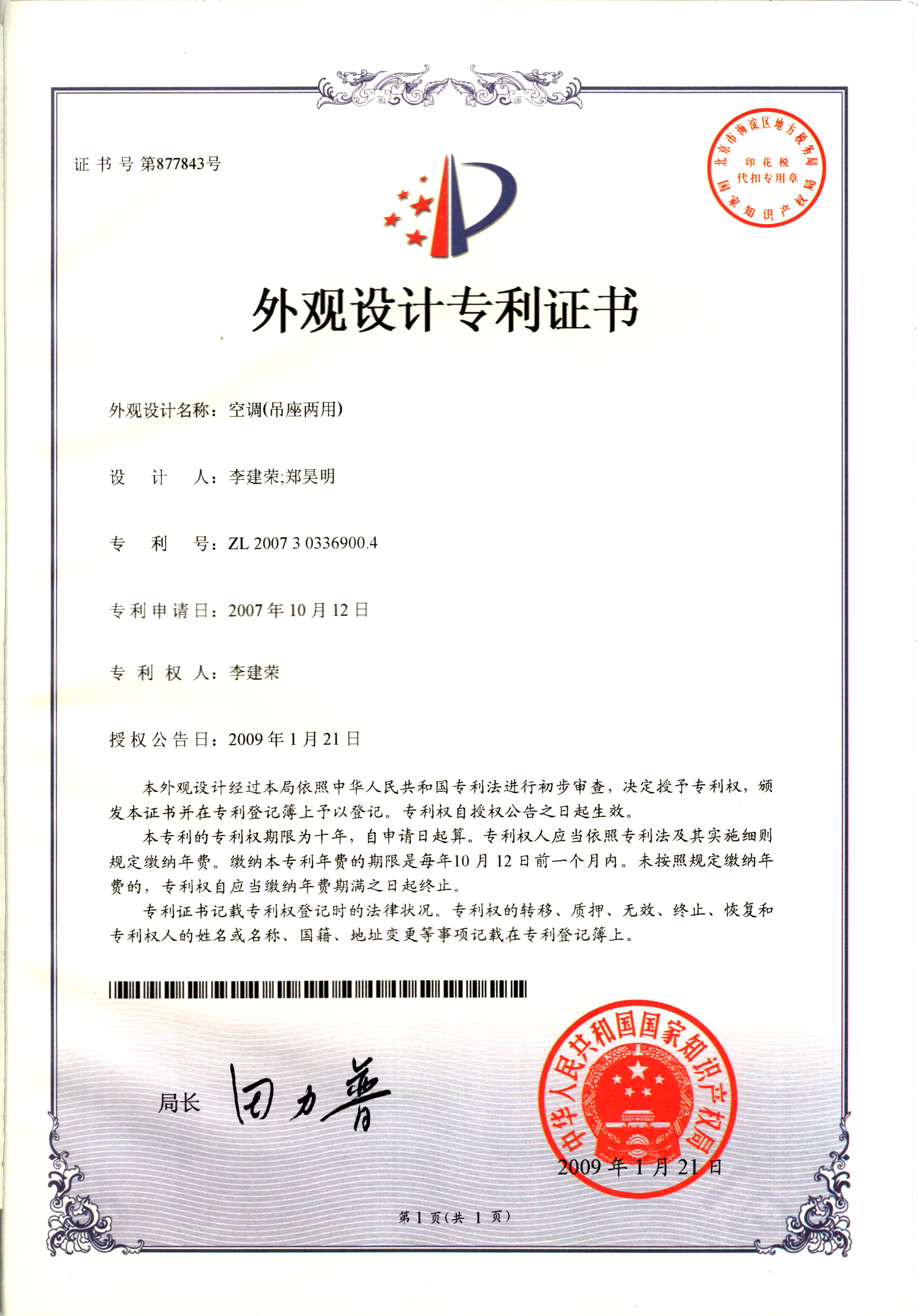 外觀設計專利證書--空調(吊座兩用...