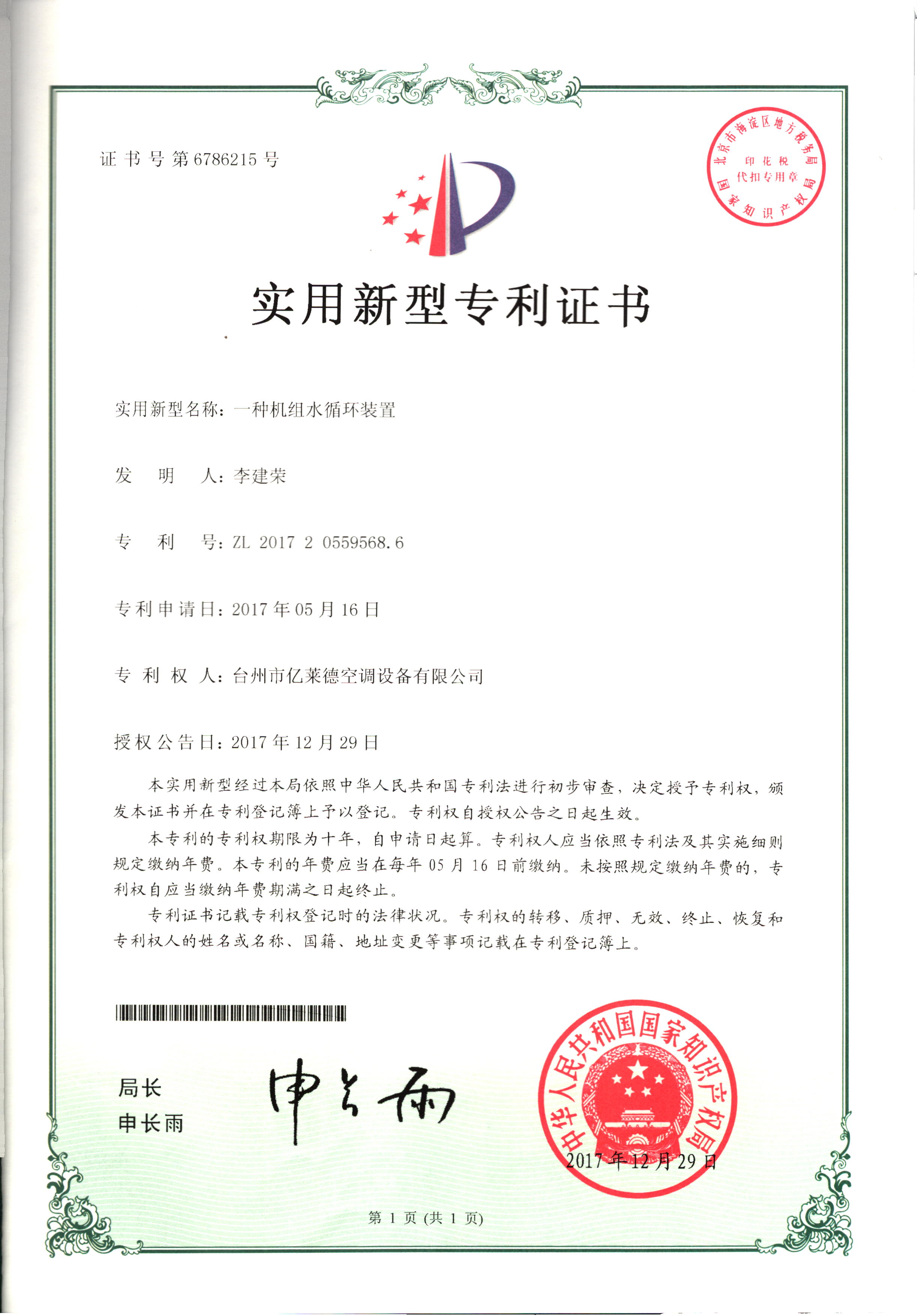 實用新型專利證書--一種機組水循...